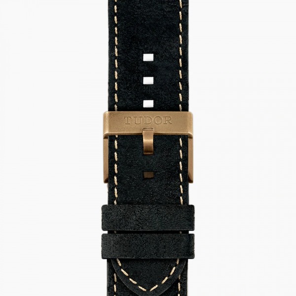 À l’instar des autres modèles de la ligne Black Bay, le modèle Black Bay Bronze propose un cadran inspiré de celui des montres de plongée TUDOR produites dans les années 50. Il adopte les aiguilles à la forme angulaire caractéristique surnommées « Snowflake » dans les cercles de collectionneurs et apparues au catalogue de la marque dès 1969. Enfin, la couronne de remontoir sans couronne de protection, tout comme les trous percés dans les cornes, sont caractéristiques des premières générations des montres de plongée TUDOR.