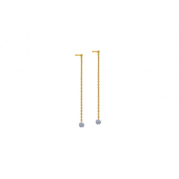On adore les deux diamants ?nus? de ces longs pendants d?oreilles 360° qui se balancent au bout d?une fine chaîne en or facettée presque invisible.Ils éclairent votre visage comme deux délicates petites lumières.Suspendus comme par magie, ils scintillent le long de votre cou.Ils ont le charme fou qui parfait toutes vos tenues.