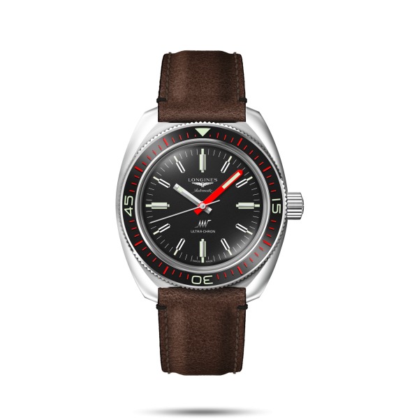 L'attrayant cadran noir grainé, accentué par une minuterie blanche et le logo Ultra-Chron original, assure une lisibilité optimale dans toutes les conditions. La aiguille des minutes rouge distinctive et l'aiguille des heures, toutes deux revêtues de Super-LumiNova®, soulignent l'engagement de Longines envers la précision et l'esthétique.