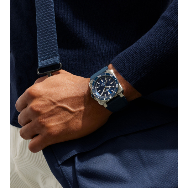 Disponible en trois versions, la BR 03 Diver Steel offre une lisibilité optimale grâce à sa lunette en céramique assortie au cadran et à ses améliorations d'aiguilles et d'index. Son bracelet en caoutchouc ou en toile synthétique assure confort et résistance, en faisant un choix idéal pour la plongée sous-marine.