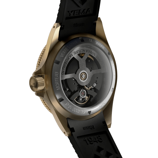 Décliné en bleu dégradé et noir laqué, le cadran emblémathique très épuré de la Superman Bronze est désormais francisé, arborant fièrement la mention MANUFACTURE FRANÇAISE à 6h pour réfleter le nouveau positionnement de YEMA suite à l'internalisation de la fabrication de composants du calibre CMM.10 et la production locale des habillages.