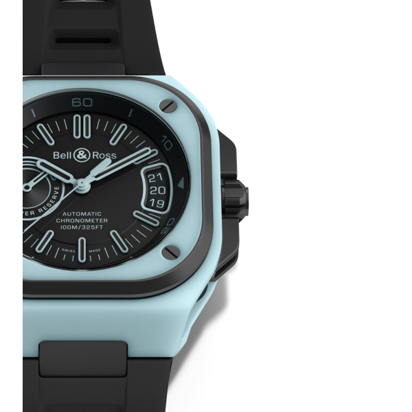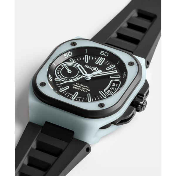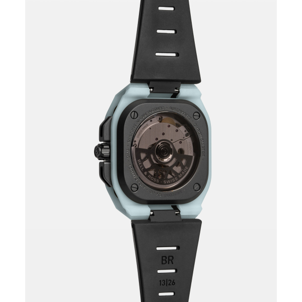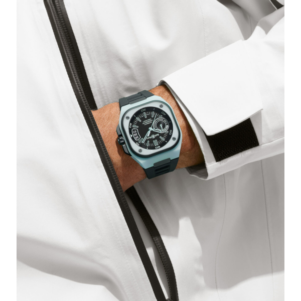 Bell & Ross a développé un matériau lumineux innovant pour la BR-X5 Lum, un composite alliant fibre de quartz époxy, matériau luminescent et résine. Ce matériau offre une luminosité uniforme et une légèreté exceptionnelle, 70 % plus légère que l'acier. La BR-X5 Blue Lum offre une nouvelle déclinaison chromatique avec ses puissantes émissions de lumière bleue.