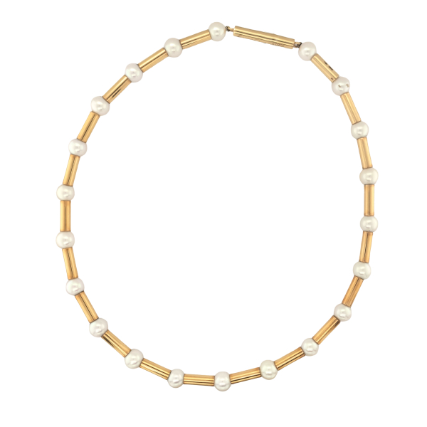 Collier “Fuseau” de la Maison Poiray en or jaune 18K (750 millièmes) composé de 27 perles de culture Akoya alternées d’éléments tubulaires.