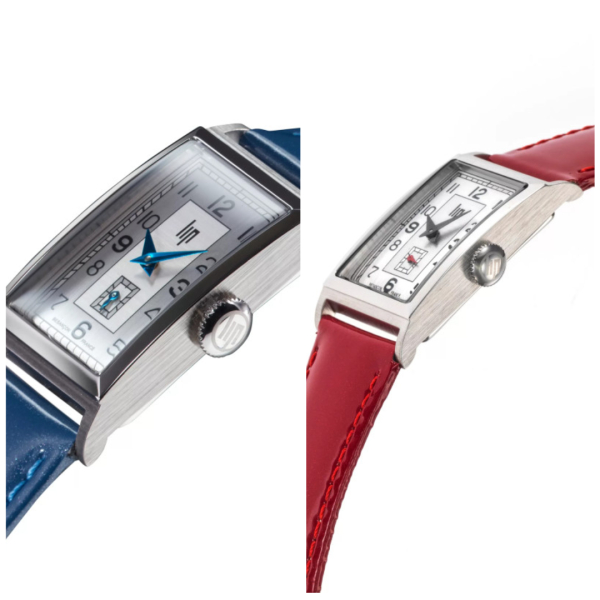 Cette montre réédite le modèle emblématique des années 1930, reflétant l'esprit Art Déco avec son boîtier en acier poli et brossé de 39 mm x 21 mm. Le cadran argenté à deux tons, orné de chiffres arabes noirs et d'aiguilles de type glaive, offre une lisibilité optimale, complétée par une trotteuse excentrée à 6 heures. Le bracelet en cuir de vachette rouge lisse et brillant, avec surpiqûres assorties, ajoute une touche de sophistication. Mouvement quartz Ronda 1064, étanchéité jusqu'à 30 mètres. Fabriquée en France, à Besançon.