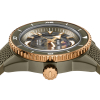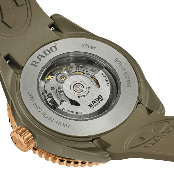 La Captain Cook High-Tech Ceramic Skeleton renferme un mouvement R808 innovant, une merveille de contrastes, de savoir-faire et de géométrie ingénieuse laissant entrevoir les diverses pièces. Ce modèle est doté d’un spiral en NivachronTM amagnétique très fiable qui a été testé dans cinq positions et garantit une réserve de marche de 80 heures. Le superbe boîtier monobloc en céramique haute technologie vert olive mate est surmonté d’une lunette tournante de couleur or rose avec un insert en céramique vert olive mate assortie au boîtier et aux cornes pour créer une harmonie visuelle. Le cadran, clair et sobre, est doté d’index géométriques généreux et d’aiguilles des heures/minutes/secondes couleur or rose, traitées au Super-LumiNova® blanc pour une meilleure lisibilité en conditions de faible luminosité. Avec son bracelet en caoutchouc et son couvercle de fermoir en céramique haute technologie vert olive assortis, la nouvelle Captain Cook montre son côté sportif.