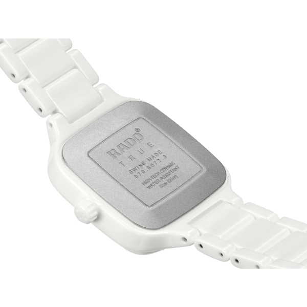 La True Square possède un diamètre de 29 mm et se compose d’un boîtier et d’une couronne en céramique haute technologie blanche polie, ainsi que d’un verre saphir plat. Grâce à son mouvement à quartz Rado R079, cette montre indique l’heure de manière fiable et précise. Les aiguilles et les index couleur or rose avec Super-LumiNova® blanc se marient parfaitement avec le cadran qui inclut une structure blanche estampée et plissée radialement. La True Square est étanche jusqu’à 5 bar. Son port très agréable est garanti par un bracelet en céramique haute technologie blanche polie avec boucle déployante triple en titane.