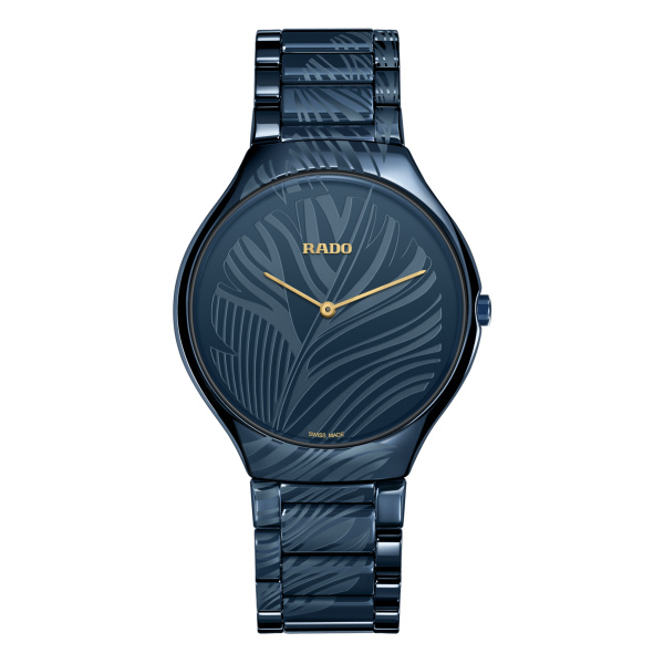 Rado a collaboré avec l'artiste et designer russe Evgenia Miro afin de créer la True Thinline My Bird en céramique haute technologie d'un bleu opulent. Avec sa délicate plume d'oiseau gravée à l'aide d'un laser de précision sur le bracelet et son image placée en diagonale sur le cadran, cette True Thinline dévoile la philosophie du temps d'Evgenia.