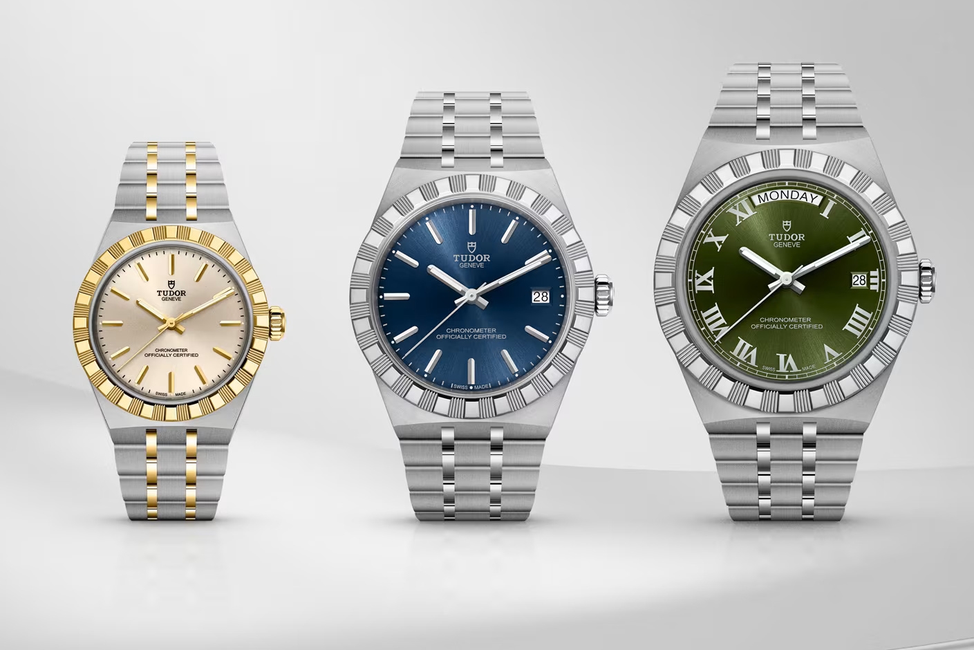 La collection Tudor Royal est entièrement revue. Trois nouvelles tailles (30, 36 et 40 mm) avec une palette élargie de cadrans : noir, bleu, vert, argent, champagne, marron, bordeaux, nacre, saumon, ivoire. La lunette crénelée a été redessinée, l'articulation boîtier-bracelet repensée.